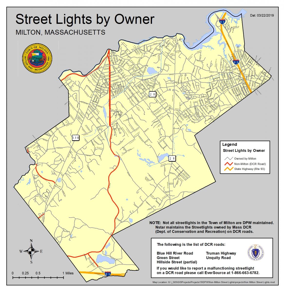 Not all streetlights within the Town of Milton are DPW maintained. Eversource maintains the streetlights owned by Mass DCR (Department of Conservation and Recreation) on DCR roads. The following is the list of DCR roads: