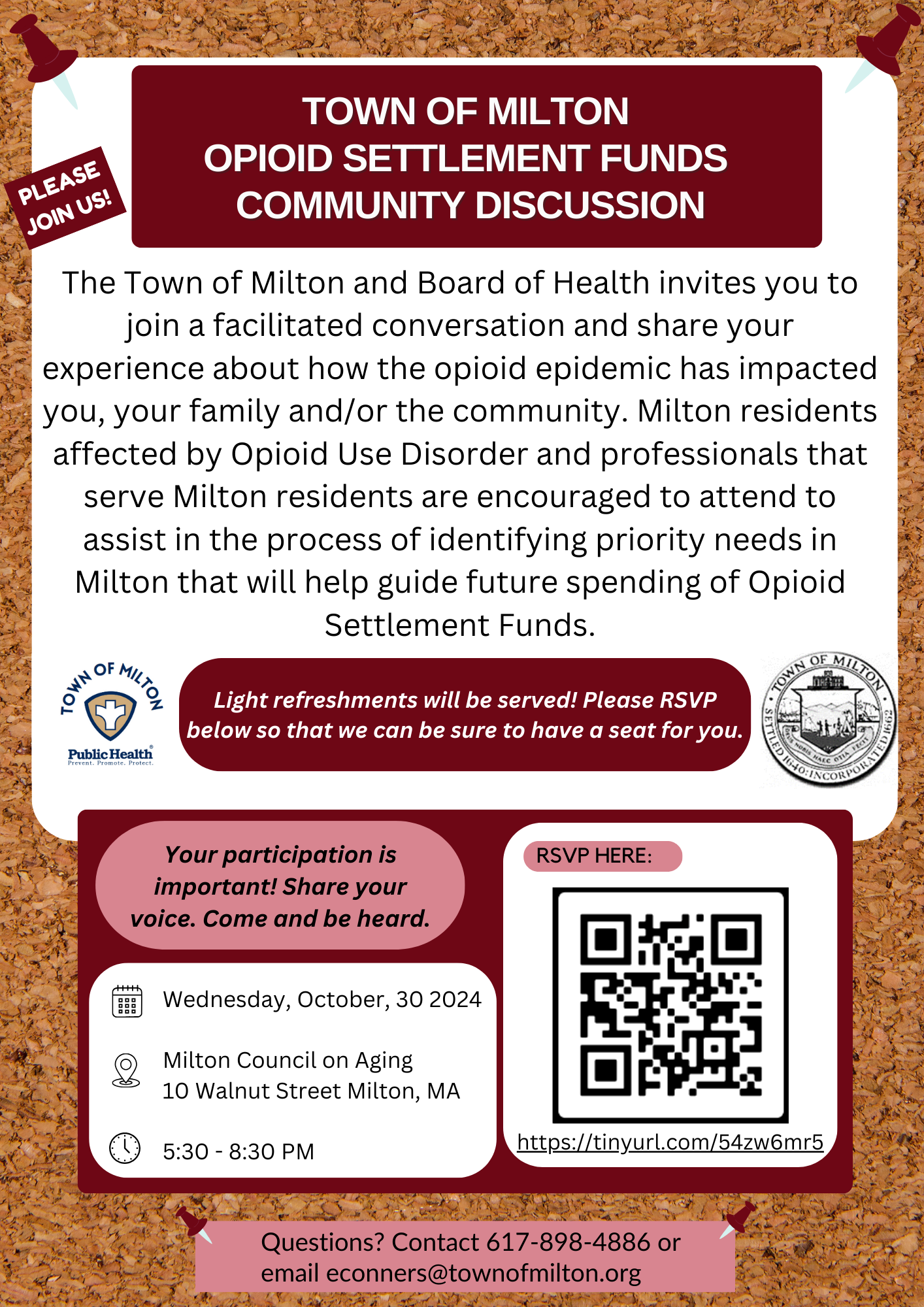 Please join the Milton Board of Health for a conversation to help the Town identify priori needs in Milton to help guide the future spending of Opioid Settlement Funds received by the Town on Wednesday, October 30, 2024 at the COA from 5:30 to 8:30